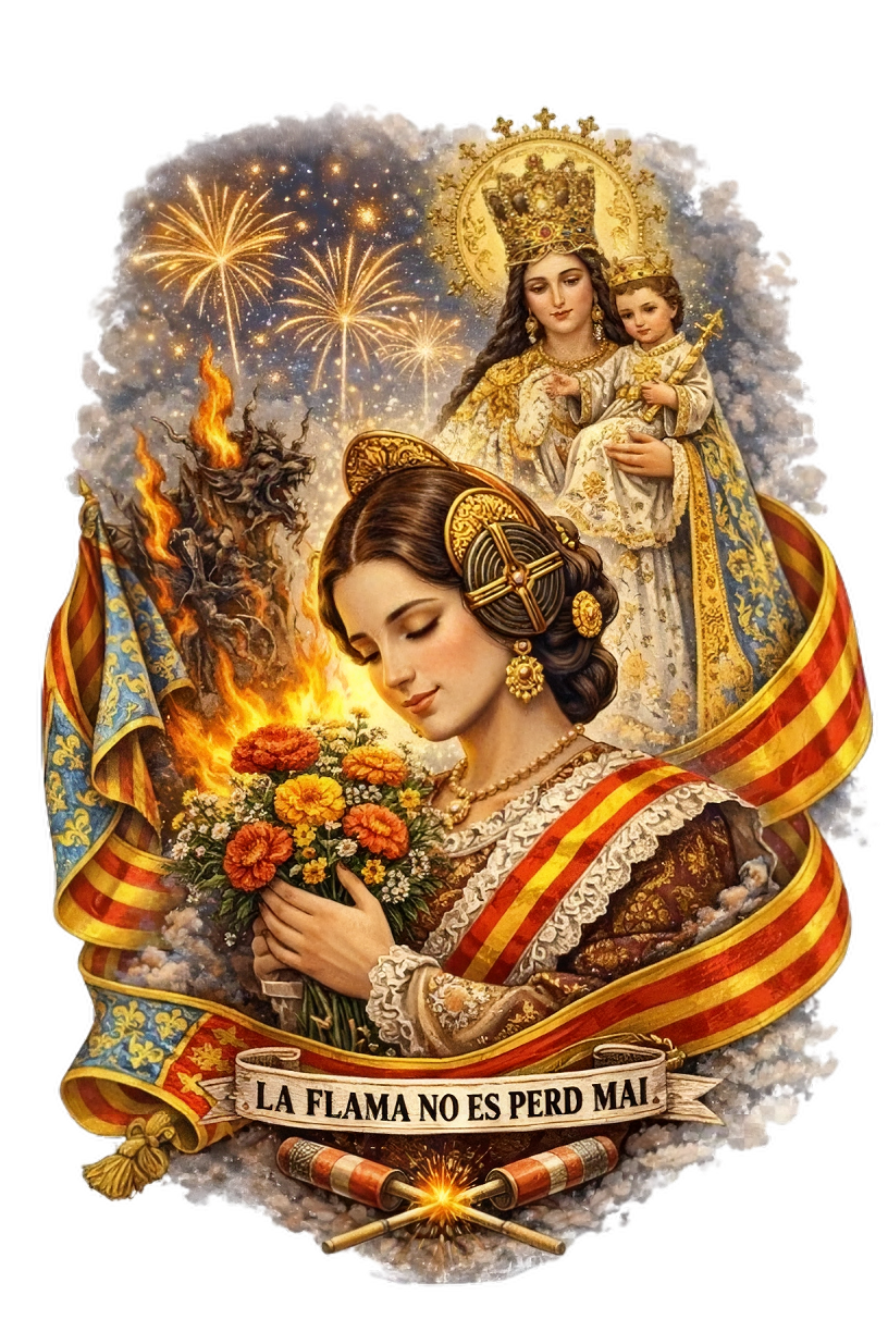 Cada prenda y complemento de esta colección comparte un diseño exclusivo cargado de simbolismo: la fallera, la Virgen de los Desamparados, la Senyera valenciana, la falla ardiendo y los fuegos artificiales se unen para representar el alma de una tradición que nunca se apaga. El lema “La flama no es perd mai” resume ese espíritu que pasa de generación en generación.